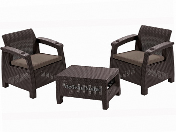 Набор изготовлен из высококачественного пластика и стилизован под плетеный ротанг. В подлокотниках имеются специальные ниши для стаканов. Пластик весьма устойчив к повышенной влажности, осадкам, низким температурам и ультрафиолетовым лучам. Они очень легкие, так что вы в любой момент можете устроить небольшую перестановку.