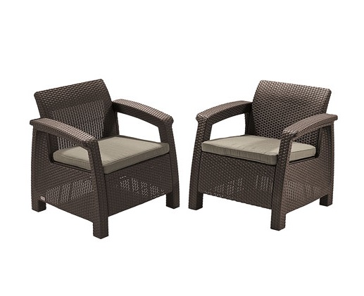 Удобный комплект из двух кресел с подушками в комплекте - создан специально под запрос клиентов, ведь многие хотят покупать сразу два или четыре кресла и стол. Комплект изготовлен из прочного полипропилена, стилизован под плетеный ротанг и оснащен мягкими непромокаемыми подушками.