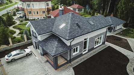 Гибкая черепица Дёке Пай Premium Женева Фладен имеет индивидуальную форму нарезки — сланец (четырёхлепестковую), которая обеспечит плотную укладку и эстетичный внешний вид кровли необходимого архитектурного стиля.