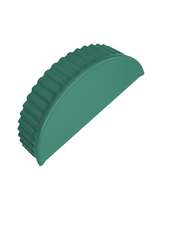 Малая торцевая заглушка Grand Line с покрытием Полиэстер 0,45 мм RAL 6005 узкоспециализированный добор для двухскатной крыши, выполняющий функцию декорирования и защиты окончания полукруглого конька малого формата от проникновения внутрь кровли при прямом попадании осадков, ветра. Доборный элемент изготавливается из тонколистового металла со стойким многослойным декоративно-защитным покрытием в цвет методом штамповки в виде полукруглого сегмента с краевыми подгибами для крепежа. Малая торцевая заглушка монтируется непосредственно в туннель конька малого со стороны фронтона, создавая органичный дизайн окончания вентиляционного канала.