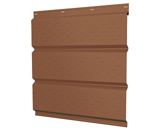 Металлический софит с полной перфорацией Grand Line с покрытием Drap 0,45 мм RAL 8004 имеет помимо штатного профилирования имитации наборки досок штампованную сетку просечек особой формы, за счет которых обеспечивается минимальное воздушное сопротивление. Вентилируемый софит используется для декорирования и защиты от прямого попадания осадков подкровельной конструкции, причем полная перфорация (когда просечка выполнена по всей площади полотна) особенно актуальна для сложных многослойных кровель и крыш с малым углом возвышения, когда из-за конструкционных особенностей естественная тяга вентиляции снижена. Софиты для карниза изготавливаются из специализированного тонколистового кровельного железа толщиной от 0,4 миллиметра со стойким декоративно-защитным покрытием. Монтаж выполняется по штатной технологии с использованием доборных и крепежных элементов.