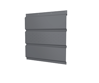 Металлический софит с центральной перфорацией Grand Line с покрытием Полиэстер 0,4 мм RAL 7024 имеют сложнопрофилированную форму с имитацией обрезных деревянных планок, причем только по центральной части полосы выполнена специальная структурированная просечка. Такие софиты сохраняют вентиляционную способность и применимы для декорирования и защиты подкровельного пространства как в горизонтальной, так и в вертикальной плоскости. Вентилируемые софиты профилируются из специальной кровельной стали толщиной от 0,4 миллиметра с современным стойким к разрушающим воздействием покрытием на основе уплотненного оцинкования и окрашенного полимера. Монтаж софитов осуществляется по классической технологии для отделки фасадов с использованием доборных элементов и крепежных, декоративных планок.