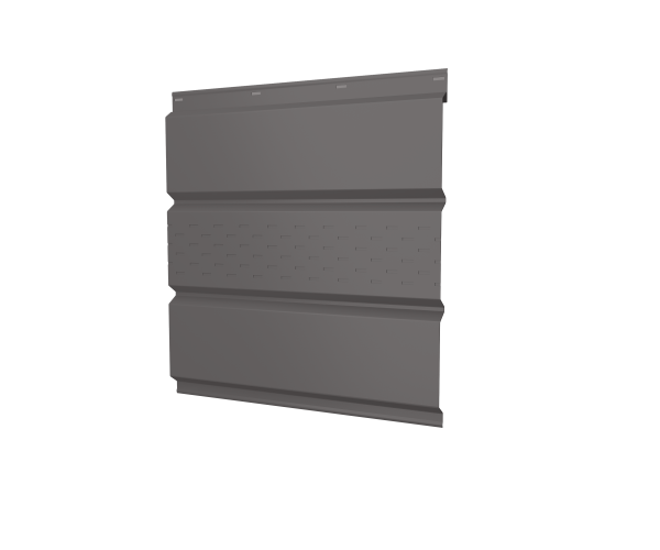 Металлический софит с центральной перфорацией Grand Line с покрытием Полиэстер 0,4 мм RR 32 имеют сложнопрофилированную форму с имитацией обрезных деревянных планок, причем только по центральной части полосы выполнена специальная структурированная просечка. Такие софиты сохраняют вентиляционную способность и применимы для декорирования и защиты подкровельного пространства как в горизонтальной, так и в вертикальной плоскости. Вентилируемые софиты профилируются из специальной кровельной стали толщиной от 0,4 миллиметра с современным стойким к разрушающим воздействием покрытием на основе уплотненного оцинкования и окрашенного полимера. Монтаж софитов осуществляется по классической технологии для отделки фасадов с использованием доборных элементов и крепежных, декоративных планок.