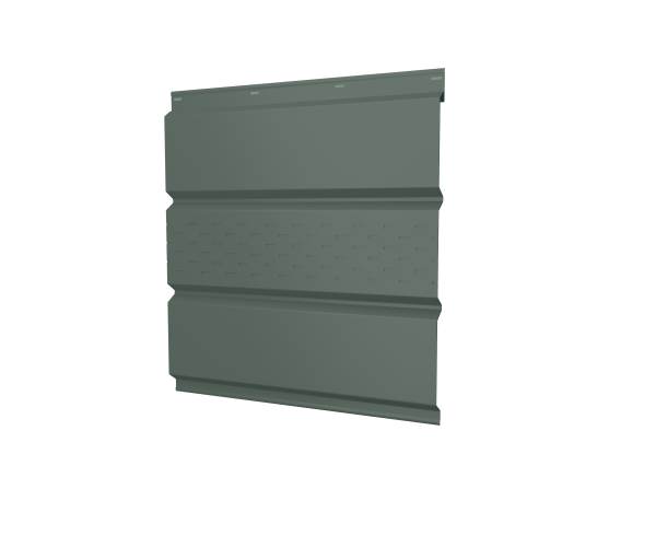 Металлический софит с центральной перфорацией Grand Line с покрытием Satin Matt 0,5 мм RAL 6005 применимы для декоративно-защитной подшивки горизонтальных и вертикальных плоскостей подкровельного пространства, причем монтаж проводится по классической технологии с использованием доборных и крепежных элементов. Софиты для подшивки свесов имеют сложную профилированную форму с имитацией наборки обрезных планок, причем только на центральной выполнена особая структурированная просечка для сохранения вентиляционной способности. Софиты штампуются из специализированной с антикоррозионным многослойным покрытием кровельной стали толщиной от 0,4 миллиметра. Оцинкование и стойкий полимер обеспечивают отличную защиту металлу и позволяют создавать органичные дизайнерские защитные конструкции подкровельной структуры.