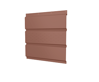 Металлический софит с центральной перфорацией Grand Line с покрытием Satin Matt 0,5 мм RAL 8004 применимы для декоративно-защитной подшивки горизонтальных и вертикальных плоскостей подкровельного пространства, причем монтаж проводится по классической технологии с использованием доборных и крепежных элементов. Софиты для подшивки свесов имеют сложную профилированную форму с имитацией наборки обрезных планок, причем только на центральной выполнена особая структурированная просечка для сохранения вентиляционной способности. Софиты штампуются из специализированной с антикоррозионным многослойным покрытием кровельной стали толщиной от 0,4 миллиметра. Оцинкование и стойкий полимер обеспечивают отличную защиту металлу и позволяют создавать органичные дизайнерские защитные конструкции подкровельной структуры.