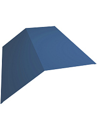 Планка плоского конька 115x30x115 Grand Line с покрытием Полиэстер 0,7 мм RAL 5005 обязательный доборный элемент двухскатной кровли с большим углом возвышения и для жаркой климатической зоны, так как ширина в нахлесте по кровле составляет всего 115 миллиметра. За счет сформированного небольшого канала шириной 30 миллиметра вентиляционная способность все же сохраняется и добор может быть использован также на крышах с гибкой плоской черепицей. Монтируется элемент на гребень места схождения скатов с целью органичного декорирования шва и защиты подкровельной конструкции от проникновения внутрь атмосферных осадков. Планка плоского конька профилируется из тонколистового обработанного в несколько слоев защиты металла со стойким слоем в виде упрощенного развернутого угла.