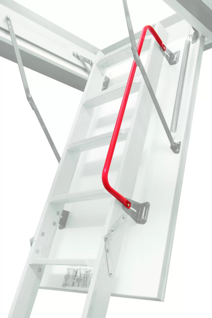Боковой металлический поручень Fakro LXH применяется для удобного подъёма и спуска с чердачной лестницы. Модель увеличивает надёжность при использовании лестницы. Поручень достаточно прост в монтаже, который выполняется с помощью крепления элемента к петлям с углов крышки люка. Стоит заметить, что модель может быть установлена, как с каждой стороны, так и одновременно слева и справа. Изделие не мешает открытию и закрытию лестницы.
