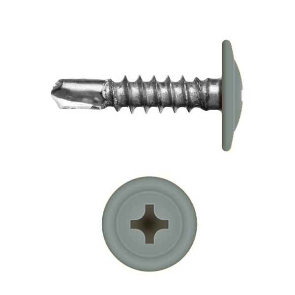 Саморез с прессшайбой по металлу 4,2x16 RAL 7037 (1000 шт) выполнен из высокоуглеродистой стали с рабочей длинной 16 миллиметров. Универсальный качественный крепеж служит для фиксации твердых материалов, в том числе металлов как между собой, так и к металлическому основанию. Наконечник шурупа выполнен в виде специального бура (сверла), поэтому без предварительной подготовки отверстия можно рабоатть с железом толщиной до 2 миллиметров. Катанная резьба с мелким шагом и плоская крупноформатная шляпка с крестообразным шлицом под отвертку и биту №2 (PH2) позволяет надежно притянуть материалы к металлическому основанию. Метизы оцинкованы слоем 3 микрометра, а шляпка самореза дополнительно окрашивается стойкими красками по каталогу RAL, RR.