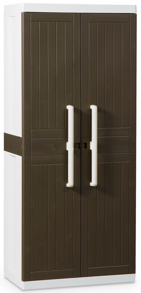 Двухдверный глубокий шкаф, стилизованный под натуральное дерево - отличное решение для улицы и для дома. Вы можете использовать его на балконе, в ванной комнате, в бане и даже зимой на улице - материал выдерживает повышенную влажность, низкие температуры, осадки, ветер и довольно устойчив против ультрафиолетовых лучей. В комплекте со шкафом идут 4 переставных полки с максимальной нагрузкой в 40 кг. Шкаф с запирающимися створками, простой, красивый, вместительный и долговечный.