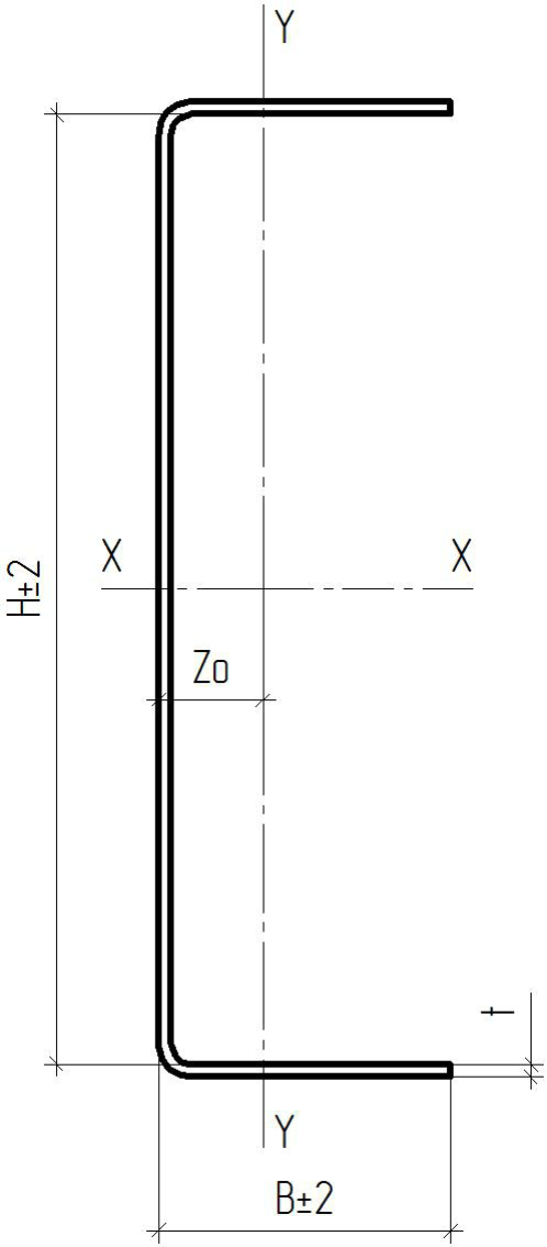 | Тип профиля | Сечение профиля Н/В/С, мм | Толщина металла t, мм | Момент инерции Ix (см4) | Момент сопротивления Wx (см3) | Момент инерции Iy (см4) | Момент сопротивления Wy (см3) | Радиус инерции ix (см) | Радиус инерции iy (см) | Координата центра масс Z0 (см) |