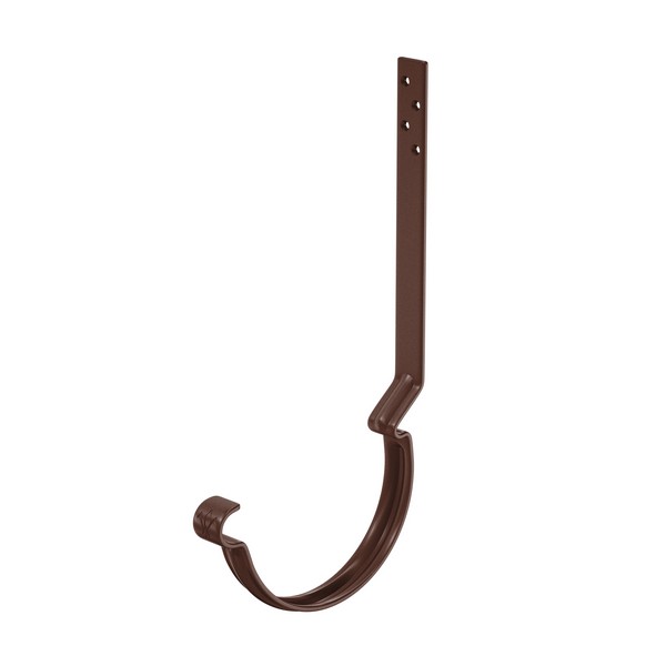 Удлиненный держатель желоба Aquasystem Премиум 125 мм, с полимерным покрытием Rooftop Drain PU, цвета RAL 8017 предназначен для удержания желоба на весу и защиты его от деформирования при сильных ветрах. Крюк монтируется к стропильным ногам на саморезы по дереву. Держатель устанавливается через каждые 500 миллиметров. Крюк произведен из оцинкованной стали толщиной 4 миллиметра и покрыт полимерным слоем.